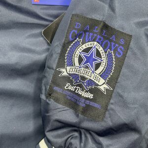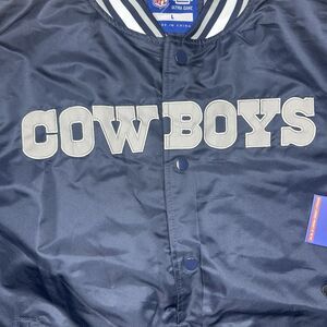 The product is a men's Dallas Cowboys football bomber jacket in navy blue with the team logo, officially licensed by the NFL. Made by Ultra Game, this jacket is designed for fans of the team and the National Football League. The jacket is in size L and is perfect for showing support during the regular season games. Made in China, this jacket is a stylish and practical way for fans to represent their favorite team and sport.