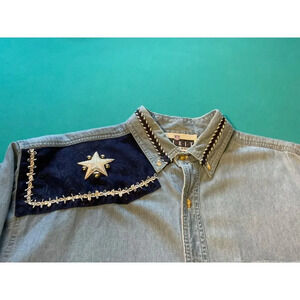 vintage dallas cowboys nfl spirit by cliff eagle denim shirt os unisex.it’s about a M/L it says OS beautiful embroidery has a spot here and there it didn’t want to mess anything up its one of a kind , MEASUREMENTS ARE ON THE PICTURES SHIPS FAST