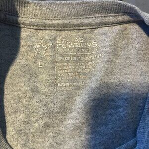 Large Dallas Cowboys Long Sleeve Shirt. 90% cotton, 10% polyester. Good pre-owned condition. Some cracks in lettering as shown in last two pics. Gives the vintage look. Very comfy shirt! Believe this is men's but can be unisex.