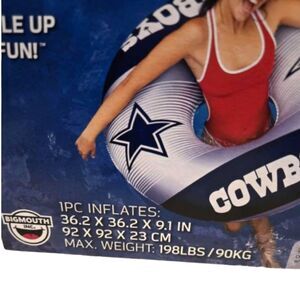 Cheer on the Cowboys while you relax in the pool with this Dallas Cowboys inflatable ring pool float! Measuring approximately 36.2" x 36.2" x 9.1", this officially licensed NFL swim tube is perfect for summer fun, tailgate parties, or showing off your team pride at the beach or pool. A great accessory for Dallas Cowboys fans and an awesome gift idea for any football lover.