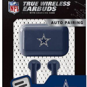 Support your team on the go with premium sound! Connect with your Bluetooth device for 3-4 hours of playtime. The built-in microphone and control connects you to friends and rivals alike. Included earbuds and charging case featuring the Dallas Cowboys official logo.