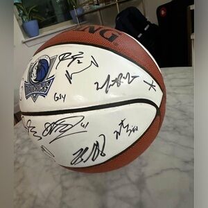 Spalding basketball featuring Dallas Mavericks logo. Includes multiple signatures. Brown and white design.