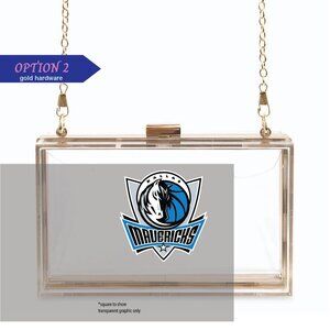 Stylish clear acrylic clutch with Mavericks logo. Perfect for sports fans! *THIS SELECTION HAS 2 OPTIONS AVAILABLE* TO COMPLETE YOUR ORDER, KINDLY SPECIFY YOUR PREFERRED OPTION BY MESSAGING AFTER COMPLETING YOUR PURCHASE. Box clutch handbag, crossbody with silver or gold hardware. Kiss lock closure type Detachable shoulder strap Length 7.1 in X width 2.2 in X height 4.1 in If you are interested in adding rhinestones to your bag, please send me a message :) Additional teams available, see other listings.