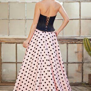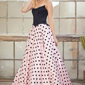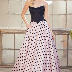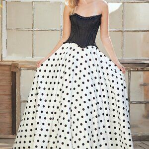 Dallyn is a playful statement gown that blends vintage charm with modern trends. Featuring a structured corset bodice with built in boning and a lace up back, this dress offers a flattering, supportive fit. The full skirt is finished with a bold polka dot pattern, one of this season’s biggest trends, adding movement and personality to the look. Perfect for prom or formal events when you want something fun, fashion forward, and unforgettable.