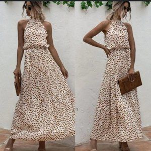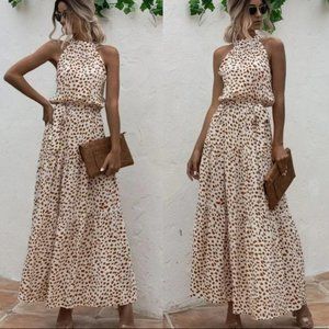 Dalmatian Print Ruffle Hem Belted Halter Dress