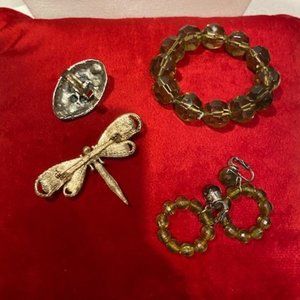 • Styled with a Green Faceted Lucite Bead Stretch Bracelet, a Green Stone/Rhinestone Statement Ring and a Green Enamel Faux Pearl Dragon Fly Brooch