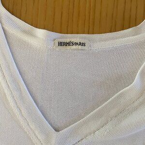 Damaged Margiela Era Hermes White Silk V Neck Tank. Beautiful but has marks throughout (pictured) that I have not tried to get out and a small hole on the back shoulder (also pictured). Size tag is missing but estimate to be either a 38 or 40. The shirt measures 18" across and 27" long .