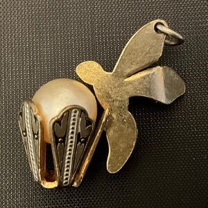 Gold tone Damascene bee landing on a faux pearl pendant.
