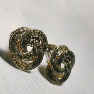 These vintage clip-on earrings feature an intricate etched knot design in gold tone. Their timeless elegance adds a touch of vintage charm to any collection.