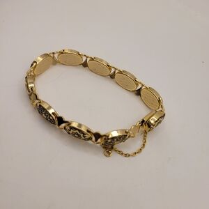 The Damascene Toledo Gold Tone Vintage Bracelet is a stylish and elegant piece of jewelry that exudes vintage charm. The wrap style of the bracelet adds a unique touch to any outfit, making it a versatile accessory for both casual and formal occasions. The gold tone finish gives it a classic and timeless appeal, perfect for adding a touch of sophistication to any look.