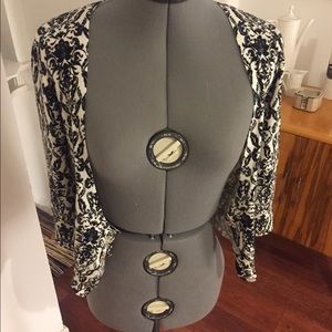 Short waisted 3/4 sleeve damask cardigan in black and white. Perfect for high-waisted pants or jeans.