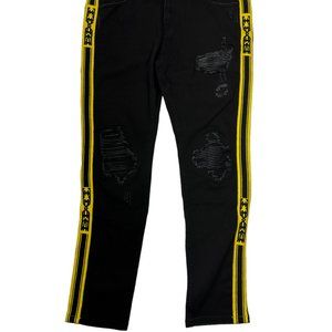 These Damati Logo Stripe Slim Fit Jeans feature yellow and black stripes down the sides, distressing, and ribbed PU lined destruction
