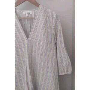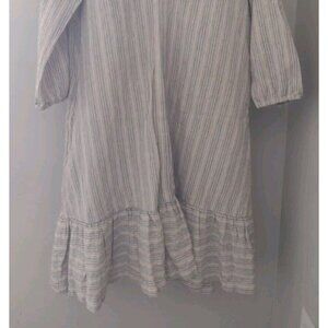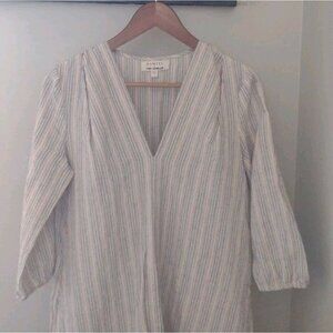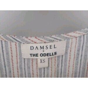 Damsel + The Odells Trapeze Flounce Dress. Size XS. Tan with blue and orange stripes. Deep V Neck. Ruffle Hem. Three fourth sleeves with elastic cuffs. In nice, preowned condition. No flaws noted. Measures approximately 18" pit to pit, 35" shoulder to hem.