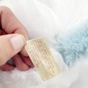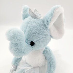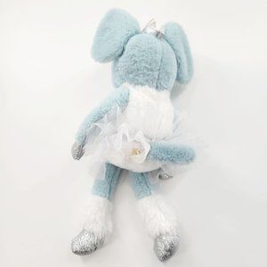 This Dan Dee piece is a blue, soft, ballerina elephant stuffed animal with a white belly, white tutu, and glittery silver hooves/feet and hands, and a glittery silver crown.