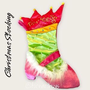 Measuring 19" in height, with a 12" stuffing compartment, this stocking adds a touch of glamour to your holiday decor. The top loop hanger ensures easy display. In good preowned condition, it has been stored in a pet-friendly and smoke-free home, offering a delightful and clean addition to your Christmas festivities. Please note a few small marks on the back, adding character to this enchanting stocking.