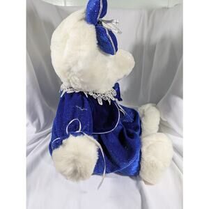 This Christmas teddy is in very good condition and ready to celebrate the holidays. There are no holes or rips or bad patches of fur. She has been displayed so there may be some slight discoloration, but as you can see in the pictures, it's not major. She measures 20" high.