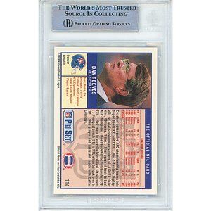 Denver Broncos 1989 NFL Pro Set football trading card #114, hand signed by 2-Time AP Head Coach of the Year Dan Reeves. Dan Reeves autographed the trading card in blue sharpie. This autograph is a clean, well placed signature that really pops nicely off of this collectible, which has been authenticated and encapsulated by Beckett Authentication Services (BAS).