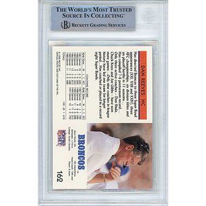 Denver Broncos 1992 NFL Pro Set football trading card #162, hand signed by 2-Time AP Head Coach of the Year Dan Reeves. Dan Reeves autographed the trading card in blue sharpie. This autograph is a clean, well placed signature that really pops nicely off of this collectible, which has been authenticated and encapsulated by Beckett Authentication Services (BAS).