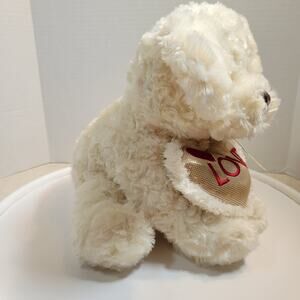 DanDee Collector's Choice plush cream-colored puppy holding a gold heart embroidered with “LOVE.” Measures approx. 10" tall and 8" long. Soft and cuddly with a ribbon bow—perfect for Valentine's Day or any occasion.