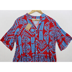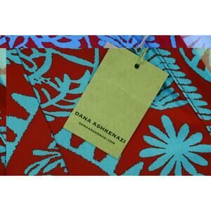 This beautiful Dana Ashkenazi designed midi dress is perfect for any beach or summer occasion. The dress features a stunning floral pattern in red and blue colors, made from a comfortable rayon blend material. The dress has a V-neckline, short sleeves, and falls to knee-length, making it suitable for both casual and travel occasions. The dress is one size fits all and has a bohemian, beachy style that is perfect for a summer vacation or resort getaway. The dress is perfect for women who want to look and feel great while enjoying the beach or pool. Get ready to turn heads with this stunning dress from Dana Ashkenazi. Made in Italy.