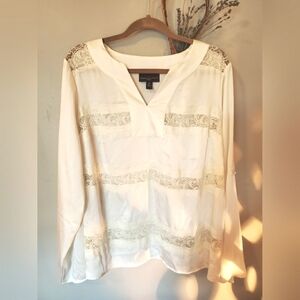 Beautiful Dana Buchman silky satin, Ivory top in great shape. Billowy sleeves and soft lace with a V neckline. Long Sleeves roll up.