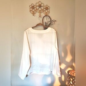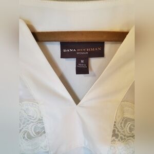 Beautiful Dana Buchman silky satin, Ivory top in great shape. Billowy sleeves and soft lace with a V neckline. Long Sleeves roll up.