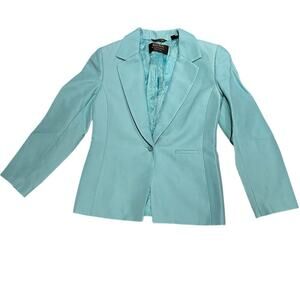 Beautiful Dana Bachman two-piece suit in size 8 Petite! The aqua color is so vibrant and the diamond texture adds a touch of elegance. This suit is perfect for any professional setting or special occasion.