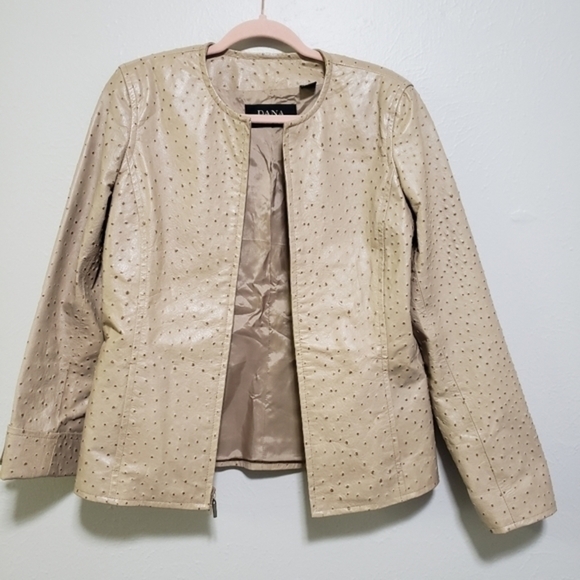 Dana Buchman 100% Lamb Skin opened double zipper closure and zipper on sleeves two pockets round neck textured leather in excellent condition