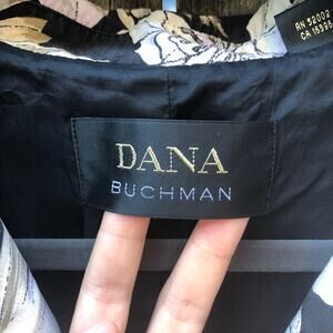 Dana Buchman 100% silk floral jacket in black and white flower print. Four snaps to close. Collared. Has pockets. 7/8 length sleeves (bracelet length). Snaps on each wrist cuff as well. Fully lined. Excellent condition, like new. Size 8.