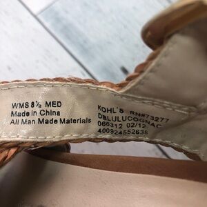 Carmel colored weave straps, 3 sizing holes on straps, one strap has wear see picture, cushioned heel pad, glue discoloration on insole see picture, colors may vary due to lighting, good used condition, Sz: 8.5 M