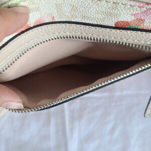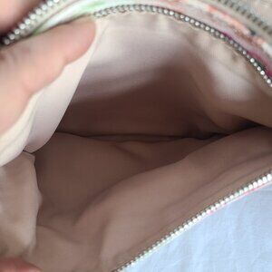 This Dana Buchman crossbody bag features a beautiful floral pattern and a zippered closure. The bag has three tiers. The front zip closure, mid zipper, and bottom front. This bag is really roomy and has a slide-in back poxket. It is made of faux leather material. The handle and strap are both made of faux leather in an ivory color. The bag is lined with beige cotton and has silver hardware accents. It is a medium-sized bag and is perfect for everyday use.