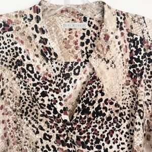 V Neck, faux collar, partially pleated front. Excellent preowned condition, no rips stains or tears. Size Tag missing Measurements laying down