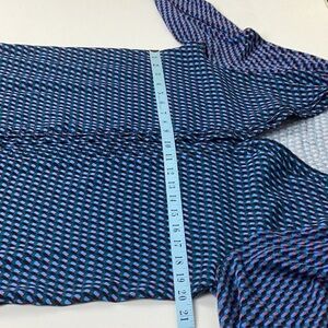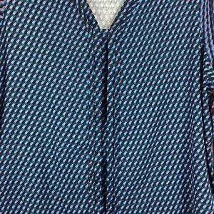 Dana Buchman popover v-neck blouse. Hi / low hem, 3/4 sleeves. Blue and red geometric print with a pleat going down the front. The body is polyester and the sleeves are a knit. Measurements included in photos.