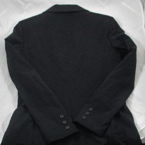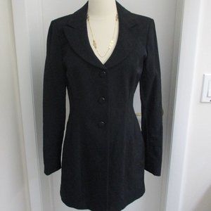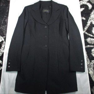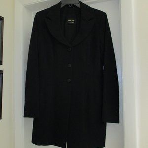 Dana Buchman Black Lined Coat - Size 4 *Measures approx. 32" Long *Sleeves measure 24" Long *Bust measures approx. 17" (Measured while lying flat from underarm to underarm) *Material is 91% Nylon, 9% Lycra *Never Worn ****FINAL SALE ***PRICE IS FIRM*****