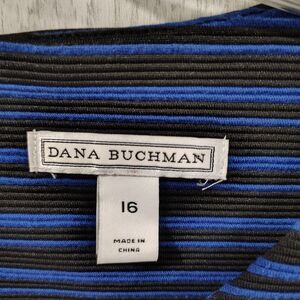This beautiful Dana Buchman dress is perfect for any occasion. The blue and black striped pattern adds a touch of sophistication to the sleeveless sheath design. The scoop neck and zip closure make it easy to wear and the dry clean only care ensures it will last for years to come.