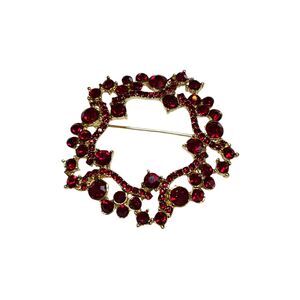 This Dana Buchman brooch pin features a festive design with a round red crystal as the main stone set in a gold tone metal setting. The brooch is adorned with rhinestones, adding an extra touch of elegance to the piece. Perfect for Christmas, anniversaries, birthdays, or Valentine's Day, this beautiful accessory exudes themes of beauty, art, love, and special occasions. It is designed for females and offers a mix of metals in its construction.