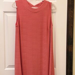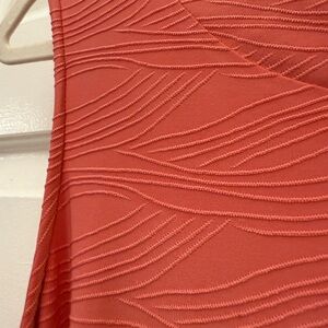 Chic coral midi dress with textured design. Sleeveless and stylish. Ideal for versatile wear.