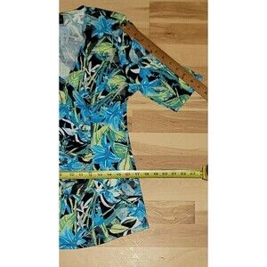 V neck, 1/2 sleeve, leafy pattern, side gathered. Bright colors. Very, very pretty!
