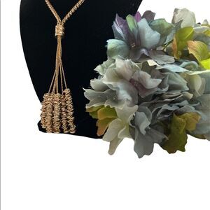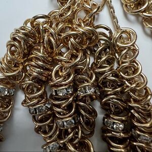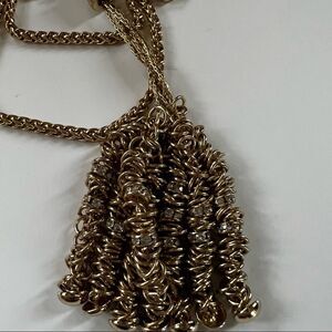 Long gold tone necklace with cubic stones, new with tags. Spiral tassel with cubic stone accents in each gold linked tassel from Dana Buchman. A great statement piece that will spice up a dress, blouse or sweater.