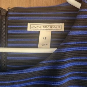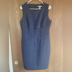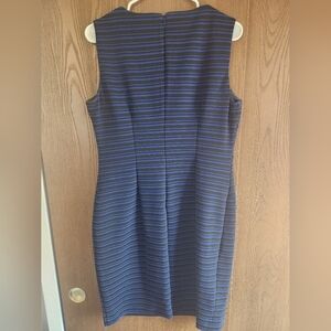 Chic sleeveless midi dress with navy and black stripes. Ideal for versatile styling.