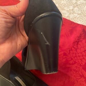 The stylish, Dana Buchman Pyra, black wedge heel dress shoe in size 6 medium. this women’s shoe features, an open toed design and a sleek black color, while there are some scuffs on the back of the heel, They are not significant and do not detract from the overall good condition of the shoe, please refer to the provided pictures for more details. The heel measures 3 inches tall, adding a touch of elegance to any outfit, step out in confidence with these fashionable wedge heel dress shoes by Dana Buchman