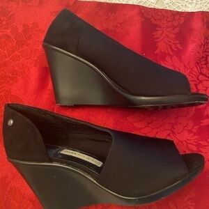 Dana Buchman Pira Black Wedge Heel. 6M. Open toe women shoe. Textile/ leather