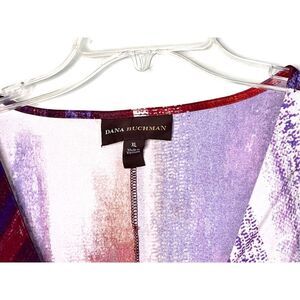 Dana Buchman Surplice Ruched Belted Abstract Dress Sz XLARGE. Beautiful design with ruching for a perfect fit that helps hide those trouble spots. Belted unlined. 96% Polyester 4% Spandex. Machine washable. Item in excellent condition. No known rips, tears, holes, stains or defects.