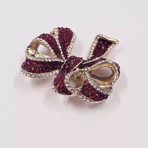 Dana Buchman Red and white Rhinestone bow shape pin. Pave design. Gold tone metal. Metal is unknown and untested. No box. Good condition. Surface wear from light use. Measures about 2" length, 2" height.