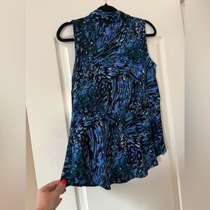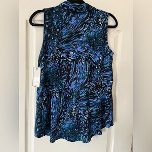 NWT brand new! Beautiful sleeveless blouse with a dynamic blue and black pattern. Perfect for summer! Polyester. Collar for added style. Measurements in photos. Small V neck. Flowy. Women’s size small. Smoke free home