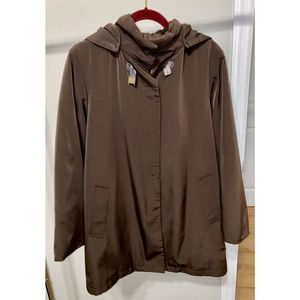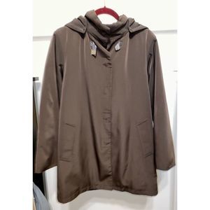Stay warm and dry in style with this Dana Buchman microfiber insulated coat in a deep chocolate brown. A detachable hood adds extra warmth and protects against the elements. And leopard print lining elevates the visual appeal of this mid-length coat along with the stand collar and hidden snap closure.