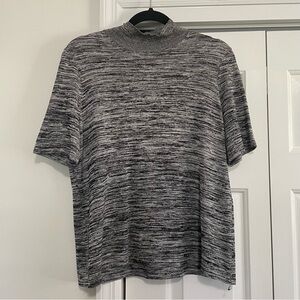 This is an incredible 2 piece set by Dana Buchman Woman. Both pieces are a size 1X. The top has a mock neck collar and the duster can be reversed and worn with solid black or black and white on the outside. Please see the last photo, there is a small spot on the front of the shirt but due tot he design of the shirt it is not noticeable, even when worn alone. Both items are freshly dry cleaned and this really is an incredible, quality set. The listing includes the short sleeve top and the reversible duster.