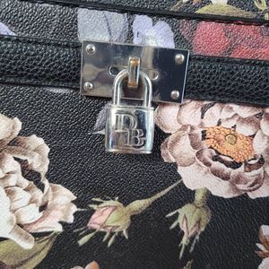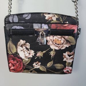 Dana Buchman dark floral square purse long adjustable crossbody strap with a faux lock on the front, snap button closure, 2 inside zipper pockets and a pocket on the back, faux leather material. In excellent pre owned condition with no signs of wear or damage.
