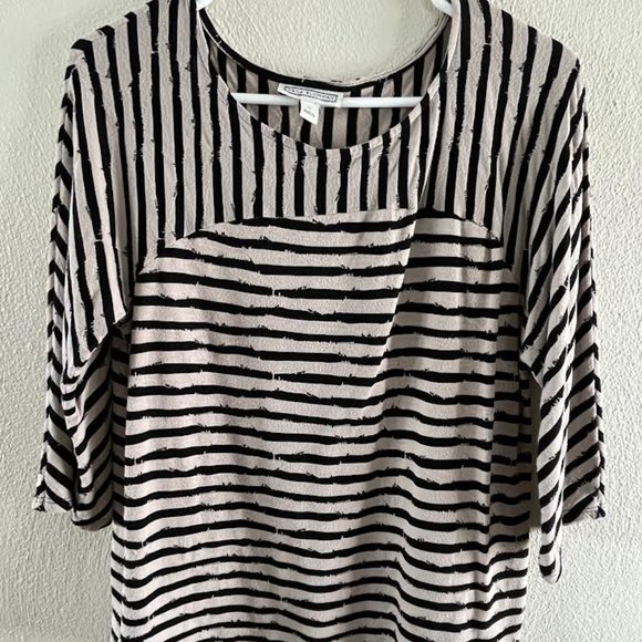 Dana Buchman, size Medium, Tan with Black Stripes, 3/4 sleeves, rayon/polyester, very comfortable
