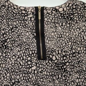 Dana Buchman women's tan and black printed sweater size small. Scoop neckline. 18 in armpit to armpit. 23 1/2-in sleeves. 23 in in length from top to bottom. All measurements taken wild flat. Zipper detail on the back. 60% cotton and 40% viscose.